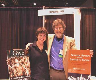 Barbara Allen and husband Dr. Arnold Perey at the American Library Association meeting in Chicago, IL where three new books (two shown here) were made public: Gwe: Young Man of New Guinea—a novel against racism, by Dr. Perey, Aesthetic Realism and the Answer to Racism, edited and co-authored by Alice Bernstein, and Were They Equal? a traditional African tale against prejudice with Tortoise, Elephant, & Hippopotamus, as told and illustrated by Dr. Perey.